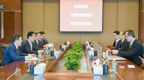 萬國控股集團(tuán)董事會(huì)主席劉雅煌(右中)與萬達(dá)集團(tuán)董事長王健林(左二)洽談