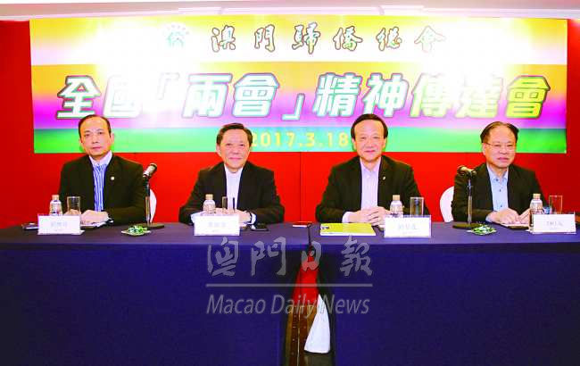 歸僑總會(huì)日前舉行全國“兩會(huì)”精神傳達(dá)會(huì),澳區(qū)全國人大代表劉藝良,以及澳區(qū)全國政協(xié)委員黎振強(qiáng)、王彬成、劉雅煌分別傳達(dá)了十二屆全國人大五次會(huì)議和全國政協(xié)十二屆五次會(huì)議主要精神,並分享了參會(huì)感受。僑總理監(jiān)事及僑界社團(tuán)代表逾百人出席。