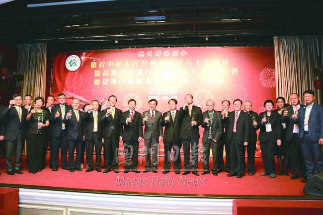 【本報(bào)消息】歸僑總會(huì)慶祝國(guó)慶六十七周年、特區(qū)成立十七周年暨該會(huì)成立四十八周年會(huì)慶聯(lián)歡宴會(huì),昨晚七時(shí)半假萬(wàn)豪軒酒家舉行。社文司司長(zhǎng)譚俊榮、中聯(lián)辦副主任陳斯喜及外交公署副特派員潘雲(yún)東等到賀。