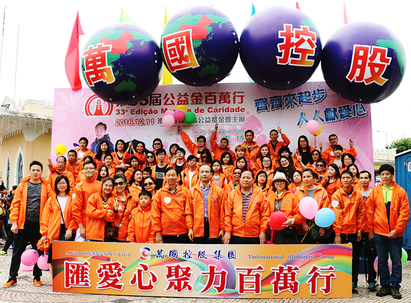 萬(wàn)國(guó)集團(tuán)董事會(huì)主席劉雅煌(前排中)帶領(lǐng)公司同仁參加由澳門(mén)日?qǐng)?bào)讀者公益基金會(huì)主辦的“第三十三屆公益金百萬(wàn)行”活動(dòng)