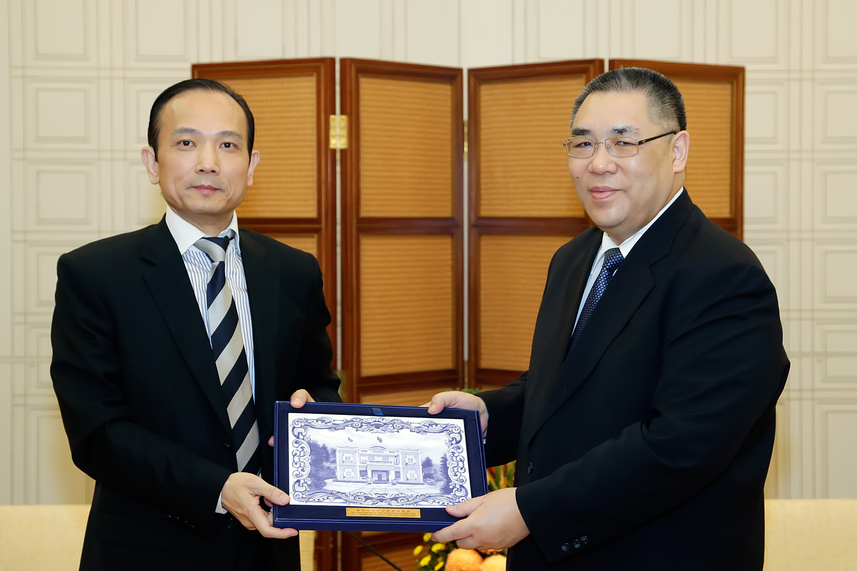 渝澳聯(lián)誼總會會長劉雅煌(左)向澳門特區(qū)政府行政長官崔世安致送紀(jì)念品