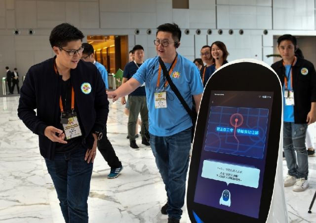 香港青年在深圳騰訊濱海大廈參觀時(shí)與機(jī)器人互動(dòng)