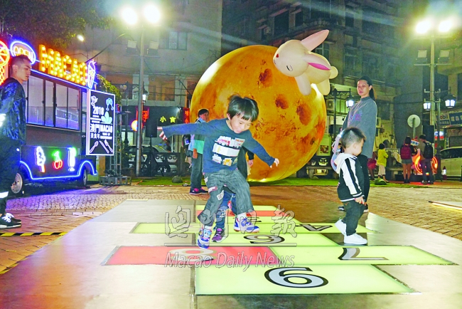 今年澳門光影節(jié)路線覆蓋範(fàn)圍較大,三條主題路線穿越五個(gè)區(qū)份的十一個(gè)地點(diǎn)。第一條路線“與時(shí)光玩遊戲”,途經(jīng)中區(qū)玫瑰堂、大三巴牌坊,以及俊秀圍、草堆街、關(guān)前正街和康公廟前地等新地點(diǎn),再結(jié)合花王堂區(qū)白鴿巢公園及望德堂區(qū)瘋堂斜巷。沿途設(shè)置“懷舊跳格仔”、“熒光樓梯”及“未來信箱”等多種不同燈飾佈置和光影體驗(yàn),與周邊建築巧妙結(jié)合,讓人仿如置身時(shí)光隧道,重拾童趣。