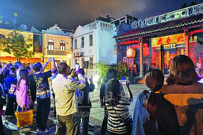 今年增設(shè)的氹仔北帝廟光雕表演,吸引旅客駐足欣賞。