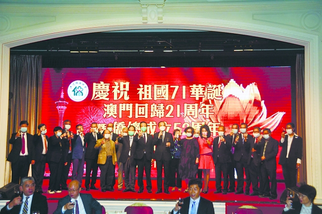 歸僑總會昨日舉行慶祝中華人民共和國成立七十一周年、澳門回歸祖國二十一周年暨僑總成立五十二周年聯(lián)歡聚會,筵開五十五席。嘉賓、負(fù)責(zé)人與僑界社團(tuán)代表、各地歸僑、僑眷同申慶祝,場面熱鬧。