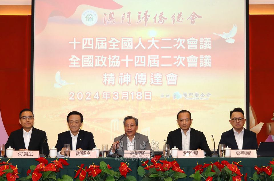 【澳門日?qǐng)?bào)消息】澳門歸僑總會(huì)於周一下午三時(shí)半在會(huì)址召開“全國(guó)兩會(huì)精神傳達(dá)會(huì)”。全國(guó)人大常委高開賢,全國(guó)政協(xié)常委何潤(rùn)生,澳區(qū)全國(guó)人大代表團(tuán)團(tuán)長(zhǎng)、僑總永遠(yuǎn)會(huì)長(zhǎng)劉藝良,全國(guó)政協(xié)常委、僑總會(huì)長(zhǎng)劉雅煌,全國(guó)政協(xié)澳區(qū)委員、僑總副會(huì)長(zhǎng)蔡明威分別講述在兩會(huì)期間的工作重點(diǎn)及體會(huì)。